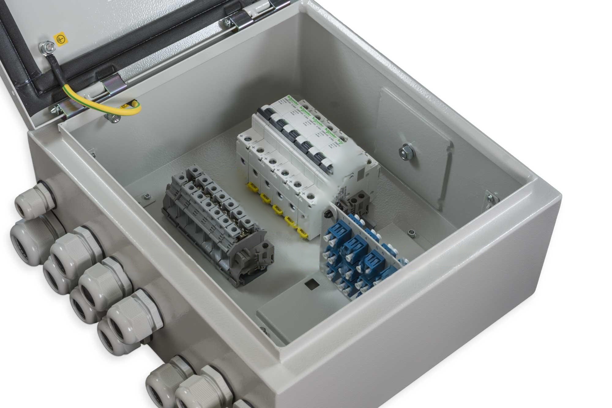 Le coffret hybride HDB24, est un coffret extérieur IP55 de raccordement énergie et fibre optique, destiné aux applications FTTA.